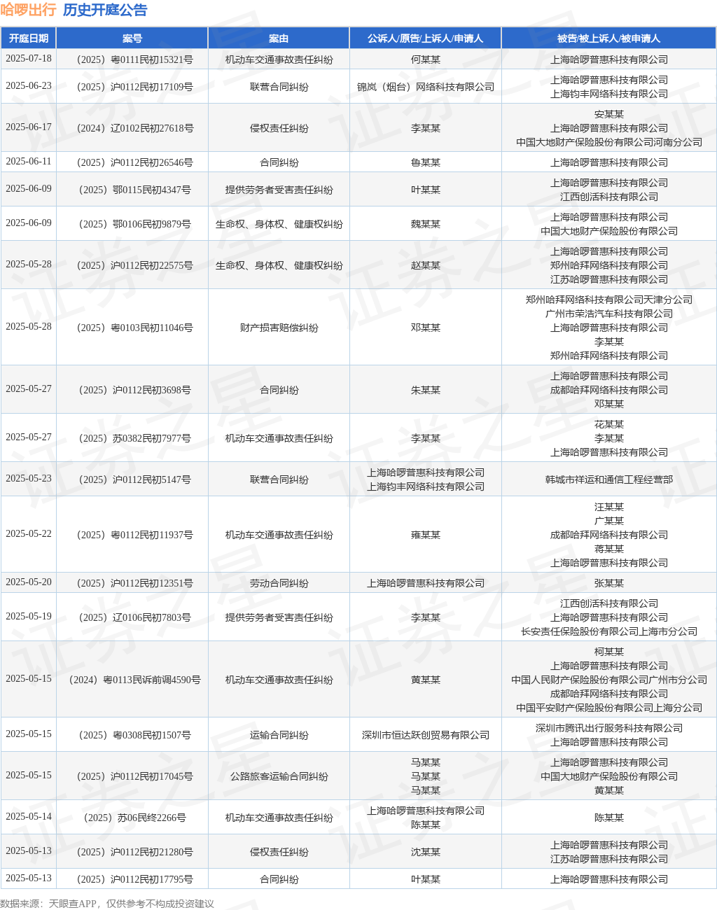 案号:(2025)沪0112民初21280号审理法院:上海市闵行区人民法院案由:侵权责任纠纷当事人信息: 原告/上诉人:沈某某 被告/被上诉人:上海哈啰普惠科技有限公司、江苏哈啰普惠科技有限公司开庭日期:2025年5月13日根据统计,近一年内以上海哈啰普惠科技有限公司为当事人的历史开庭公告有275则,其中案由为“机动车交通事故责任纠纷”的公告以84则居首,其次为“合同纠纷”有37则,“生命权、身体权、健康权纠纷”有20则。历史开庭公告(前20条)如下: